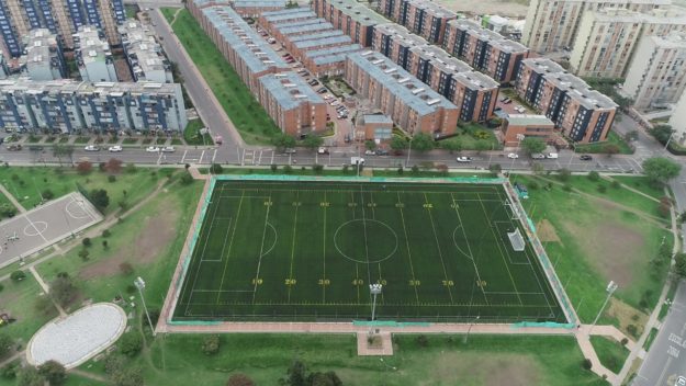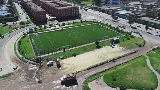 Client: IDRD. Type: Soccer field. Works carried out: Constructión of soccer synthetic grass Field with equipment and counter impact enclosure.